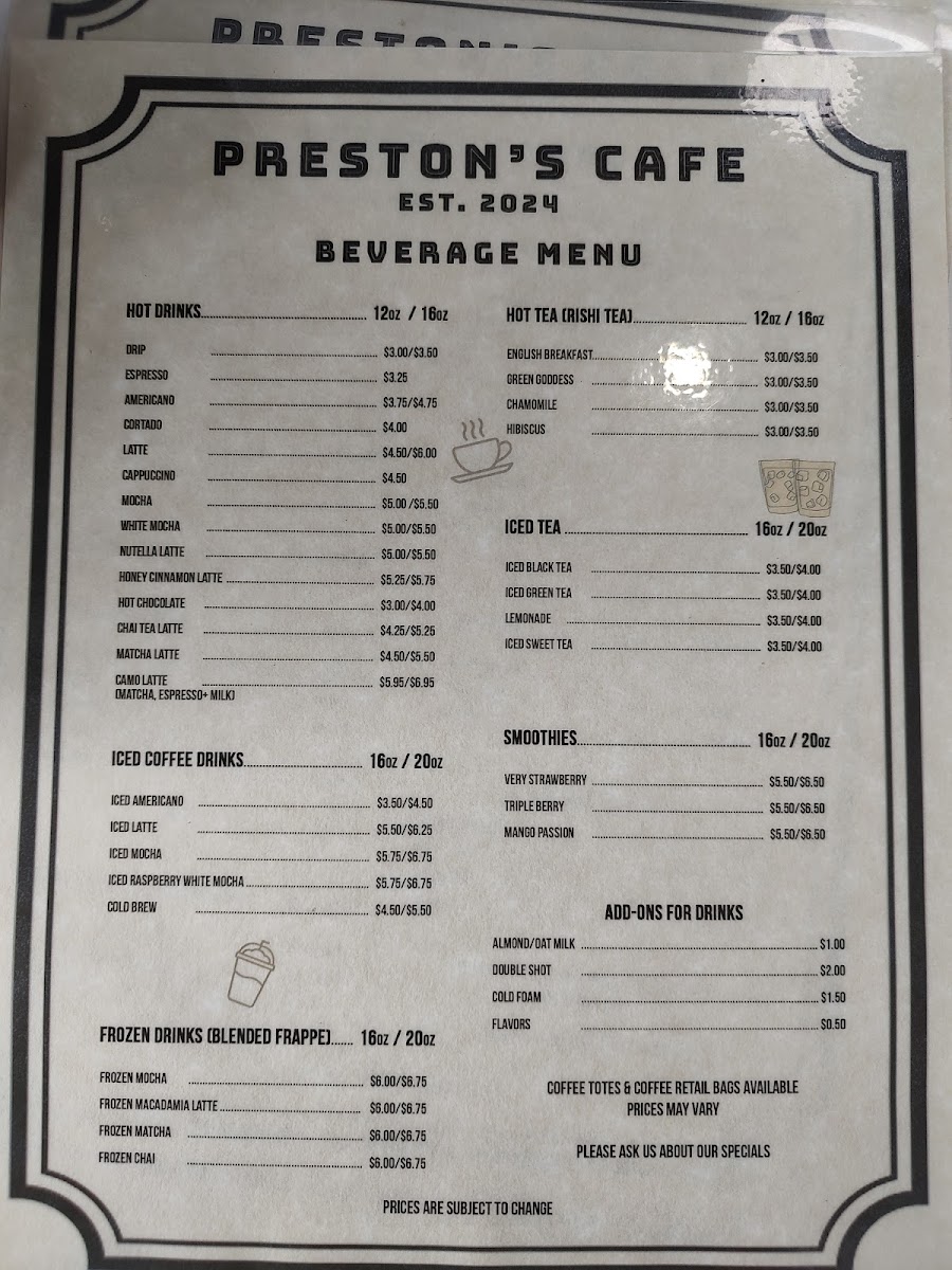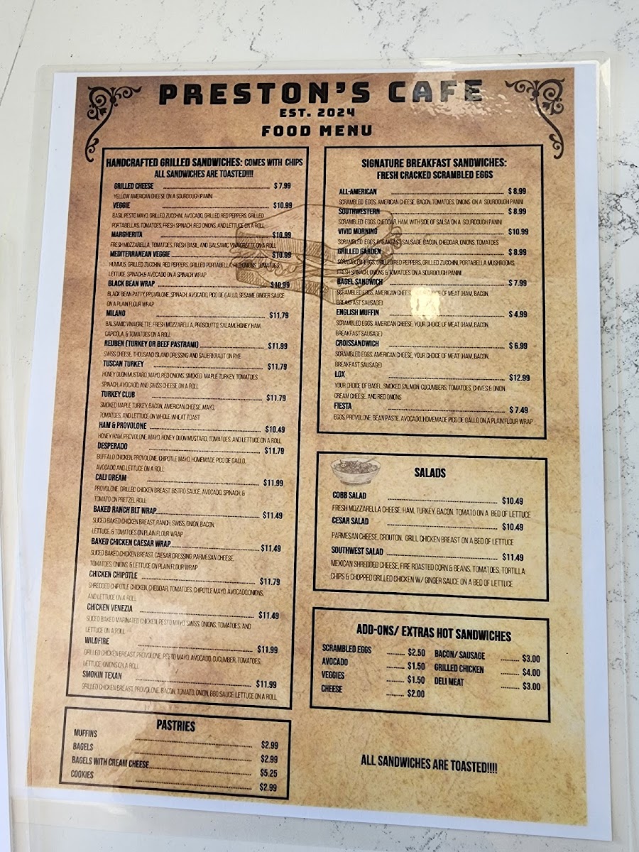 Whether you're dropping in for a quick sandwich or savoring a cozy afternoon with coffee, Preston's Cafe promises to satisfy your cravings.
